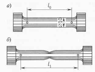 Рис. 2.1. Круглый образец для испытания на растяжение: до (а) и после (б) испытания; l0 и l1 расчетная длина до и после испытания