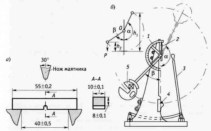 Рис. 2.7. Схема испытания на ударную вязкость: а — размеры образца, положение ножа маятника; б — схема маятникового копра: 1 — шкала; 2 — стрелка; 3 — тормоз; 4 — образец; 5 — маятник