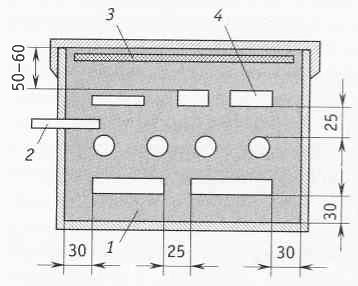 Рис. 9.5. Схема укладки деталей в цементационный ящик: 1 — карбюризатор; 2— контрольный образец «свидетель»; 3 — асбест; 4 — детали