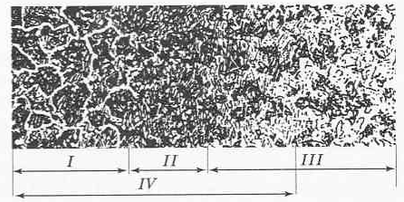 Рис. 9.6. Микроструктура цементированной стали по зонам: I — заэвтектоидная; II — эвтектоидная; III — доэвтектоидная; IV— глубина цементированного слоя