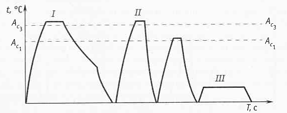 Рис. 9.7. Схема термической обработки деталей машин ответственного назначения после цементации: I —цементация; II —двойная закалка; III —низкий отпуск