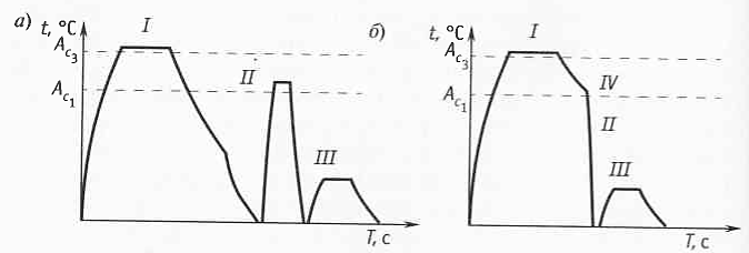 Рис. 9.8. Схема закалки стали после цементации: а — после охлаждения с цементационной температуры до комнатной; б — с подстуживанием; I — цементация; II — закалка; III — отпуск; IV— подстуживание